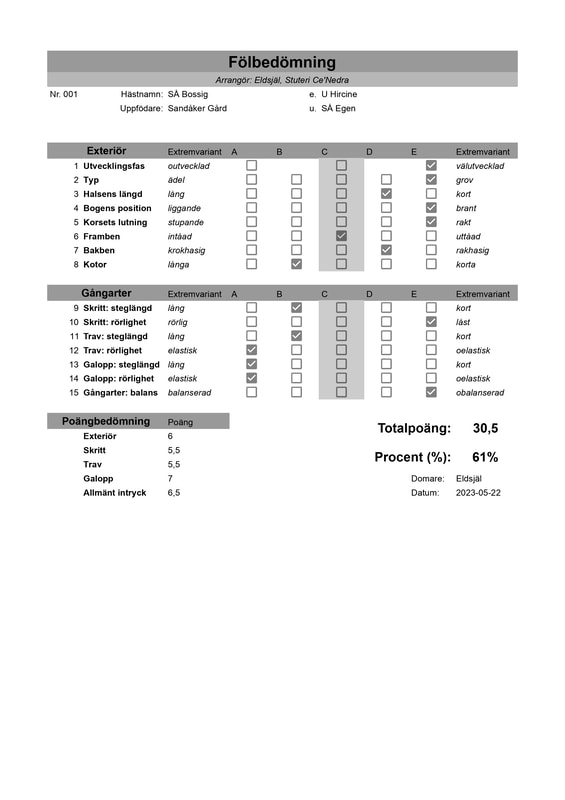 2023-01-01VHF | SÅ Bossig // 1-E, 2-E, 3-D, 4-E, 5-E, 6-C, 7-D, 8-B, 9-B, 10-E, 11-B, 12-A, 13-A, 14-A, 15-E // Exteriör: 6, Skritt: 5,5, Trav: 5,5, Galopp: 7, Allmänt intryck: 6,5 // Totalpoäng: 30,5, Procent: 61% |