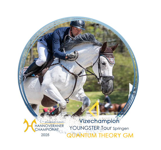 Sein Vater Prämienhengst und ASJA Hengst, seine Mutter erfahrene Zuchtstute, beide mit hohem Potenzial im Springsport. Quantum Theory GM ist das geborene Springpferd. Der Schimmelhengst zeigt sich als eher kompakt gebaut, bringt aber dennoch einen guten Körperbau mit, der in Summe sehr harmonisch und stimmig wirkt. Sein stabiles Fundament mit stabilen Gelenken und einer schön gewinkelten Hinterhand verbindet die schräg liegenden Schultern des Hengstes zu einem, ja so wirkt es, fließenden Springmotor. Durch die frei liegenden Schultern des Hannoveraners vollführt er sehr raumgreifende Bewegungen. Diese Bewegungen und Eleganz kombiniert er mit viel Schwung, der über seine Hinterhand durch seinen Körper kommt und sich in seinen Bewegungen festigt. In seinem jungen Alter fällt es ihm manchmal noch schwer seine Balance zu wahren und seinen Körper bis ins kleinste Detail zu kontrollieren, doch es ist bereits erkennbar, dass er von Tag zu Tag sicherer und unerschütterlicher in seiner Balance und Trittsicherheit wird. Auch Quantum Theorys Geist und Ideen sollten nicht unterschätzt werden. Der Schimmelhengst denkt stets fleißig mit und erlernt so nicht nur schnell Dinge, er findet auch Wege, um sich seine Aufgaben einfacher zu machen oder sie auf seine Art zu lösen. Diese Gedanken hält er dann auch gerne fest und möchte sie ausprobieren, was zu Beginn schon mal zur Herausforderung wird, aber je besser man ihn kennt, desto besser gewöhnt man sich daran. Obwohl er im Training gerne mal experimentiert und sich selbst austestet, hier genießt er auch den Freiraum und das Vertrauen, das ihm gegeben wird, ist er auf Turnieren sehr zielsicher, strebsam und kooperativ. Fein an den Hilfen stehend nimmt er Signale mit, egal ob sie unterschwellig oder gezielt gesetzt wurden. Quantum Theory zeigt sich zwar als sehr selbstbewusst und hält sich selbst für den Tollsten, erschrickt sich aber dennoch in ungewohnten Situationen, weshalb seine Reiter sich besonders durch Ruhe und Selbstbewusstsein auszeichnen sollte, um in perfekter Harmonie mit dem Schimmel zu stehen.