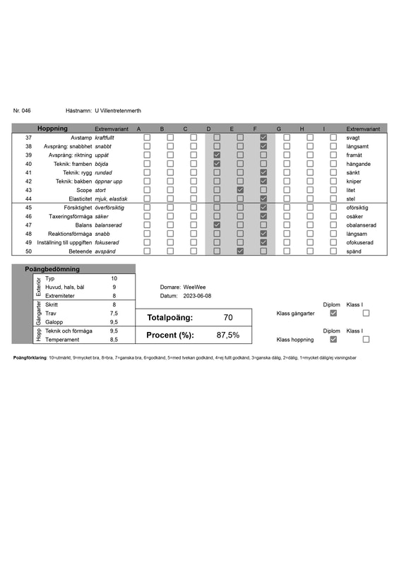 Typ: 10, HHB: 9, Extr.: 8, Skritt: 8, Trav: 7,5, Galopp: 9,5, Hopp. teknik: 9,5, Hopp. temperament: 8,5 //